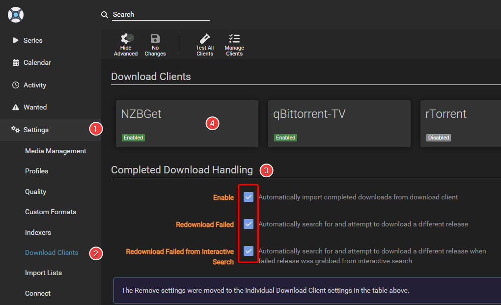 In step 4, select NZBGet, scroll to the bottom of the new window where it says Completed Download Handling, and check both boxes.