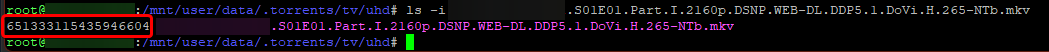 • In your terminal, cd to your download location and run ls -i file.mkv or type ls -i /path/to/your/download/location/file.mkv